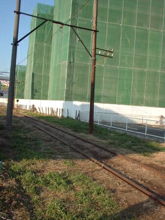 カーブ区間の架線には吊架線とトロリー線が残っていますが、