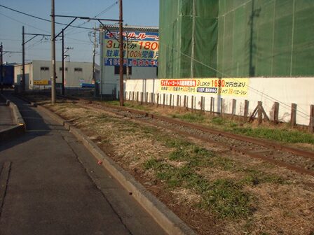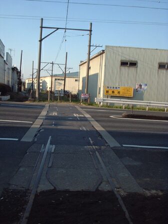 線路のすぐ横に道路があり、道路と線路のさかいには柵がありません。