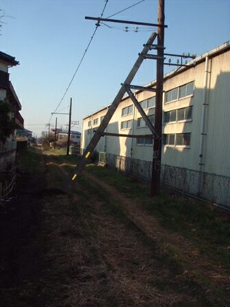 休止後に(もちろんですが)架線柱倒壊防止につけたものだと思います。