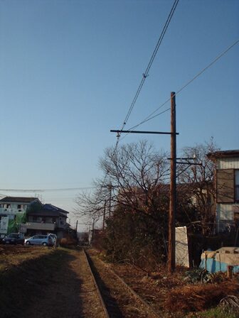 トロリー線は吊架線から別れ、最後の木製架線柱にくくりつけてあります。