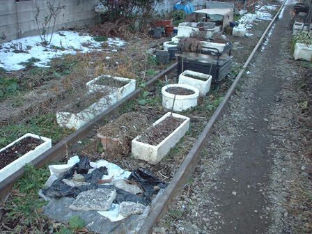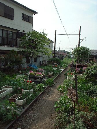 線路にプランターや植木鉢を置いています。