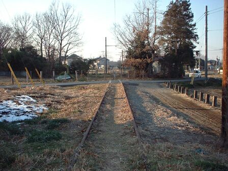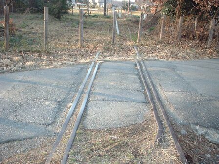 資材置き場脇の踏切の線路。この踏み切りは比較的原型を残しています。