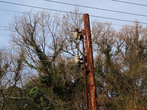 中段の右側の2線は引き通し用の低圧ピン碍子で引き留めています。