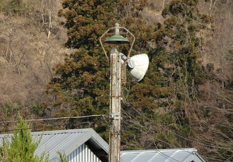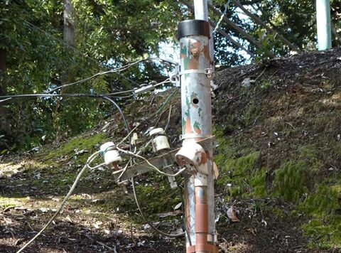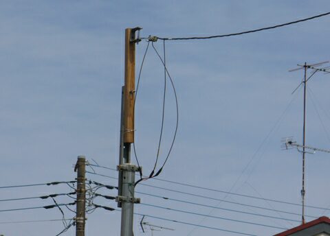 管型ポールに腕金を足して、更に木を継ぎ足して引込線を支持しています。