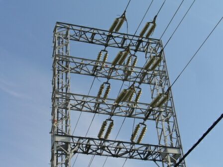 塩浜南線56号鉄塔は碍子の位置が偏った矩形鉄塔になっています。