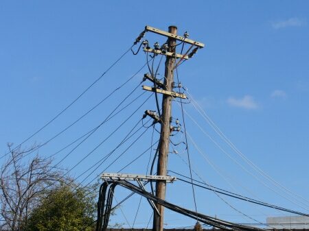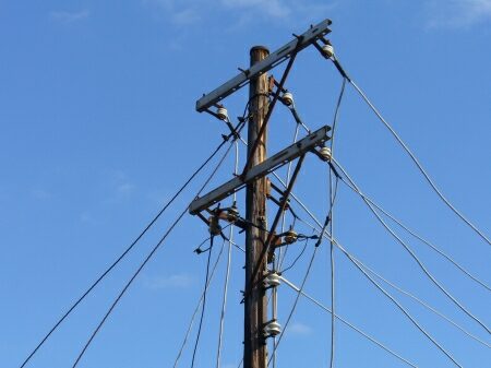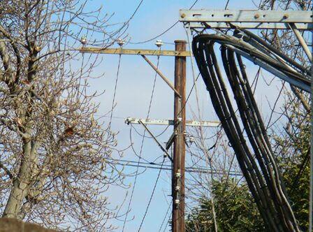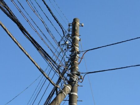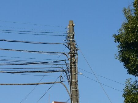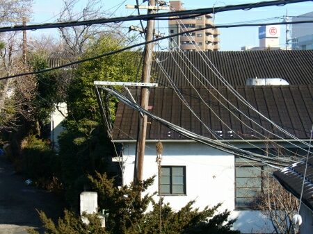 そこから出ている低圧線は、ごちゃごちゃ通信線も支持しているので、