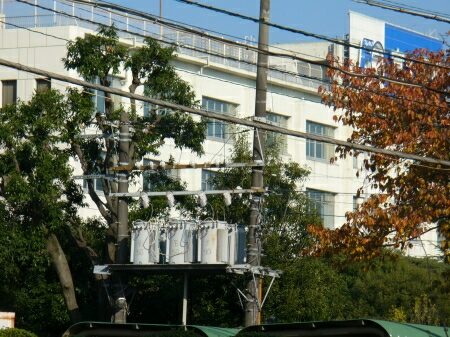 下の太い沢山の電線は変電設備とその前にある建物を結んでいます。
