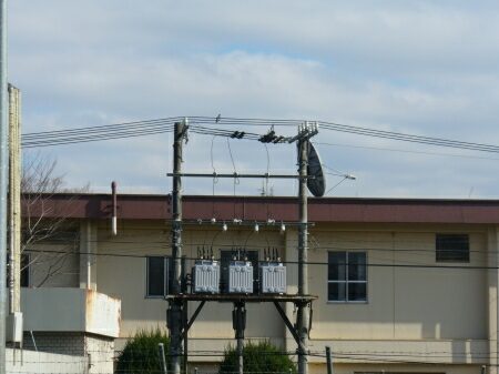 下の2回線の太い方から変圧器へ引き下げ線が分岐しています。