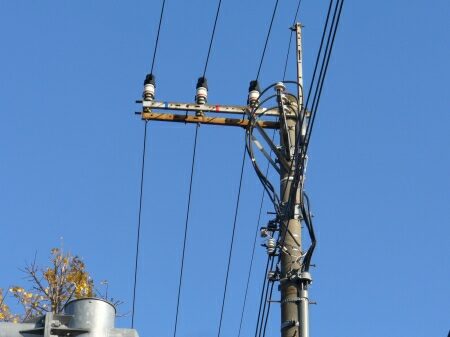 踏み切りの反対側の配電線柱も同じような装柱になっています。