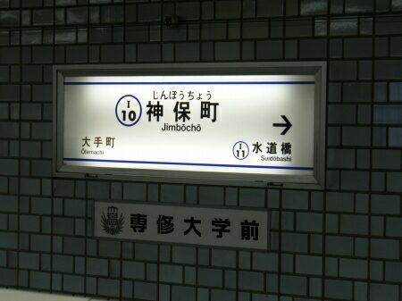 神保町駅の駅名板の下には「専修大学前」の副名称が付いています。