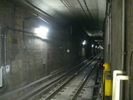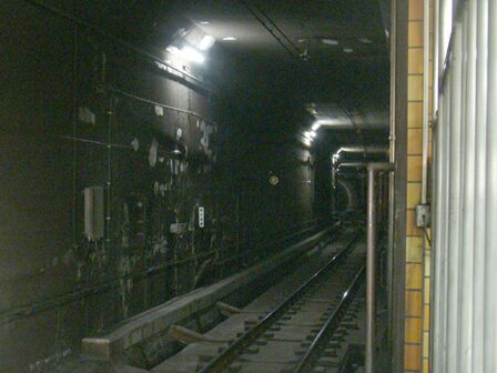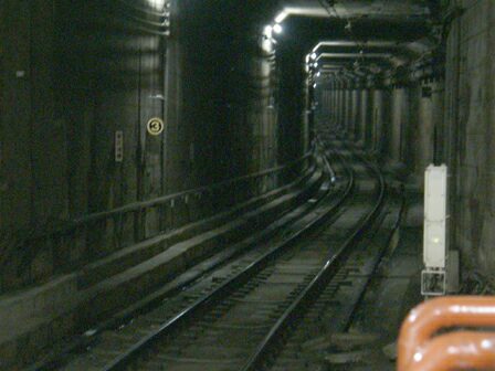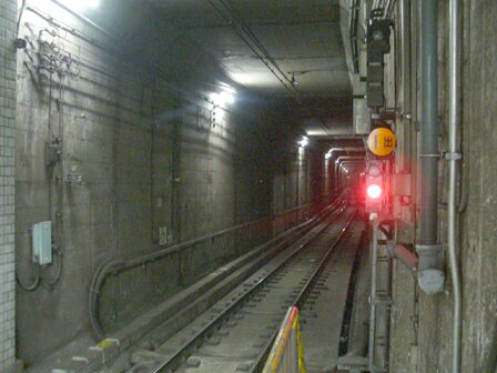 内幸町駅を出ると北行南行が急カーブで合流します。