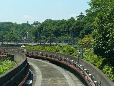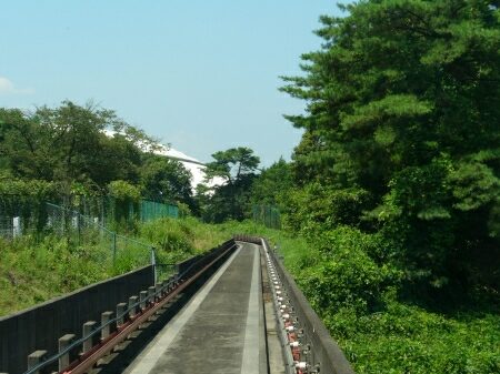 西武ドームが間近になると下り勾配になり、多摩湖と分かれます。