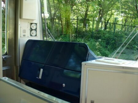運転士は運転するとき、紺色のカバーを開き、運転台を取り出して運転します。