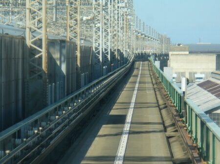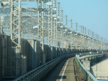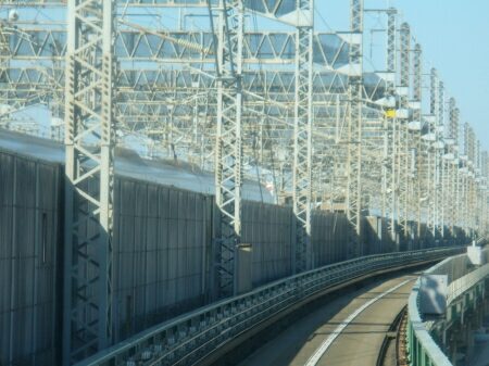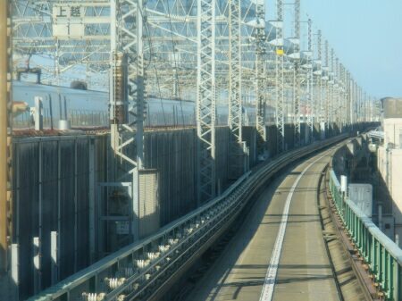 新幹線の用地の広がりにあわせてカーブを曲がっていきます。