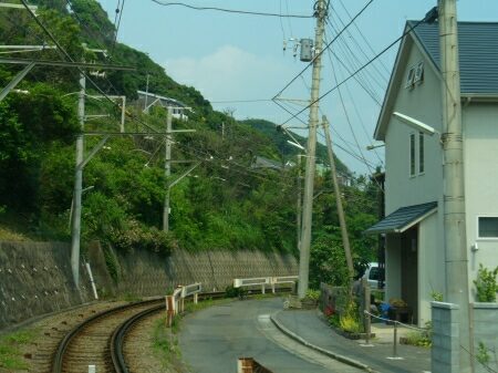 七里ヶ浜の集落をまわりこむように線路が敷いてあります。