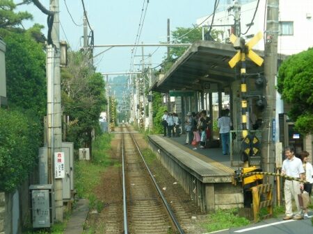 住宅地に囲まれた片面1線の駅です。由比ヶ浜までは若干距離があります。