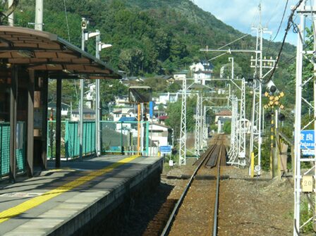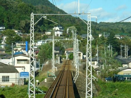 県道の上を交差し、山裾にぶつかるとカーブを曲がります。
