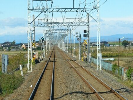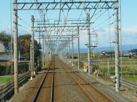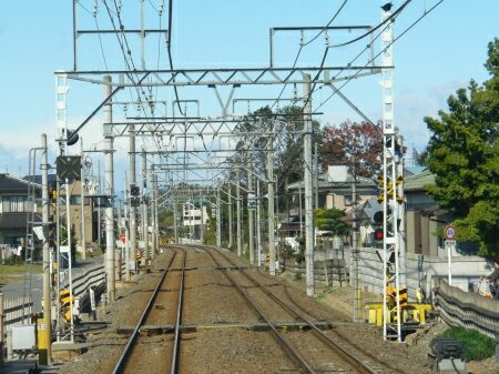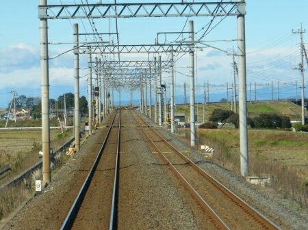 栗橋駅から先は東武標準の細い架線鉄柱が見られるようになります。