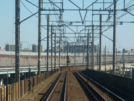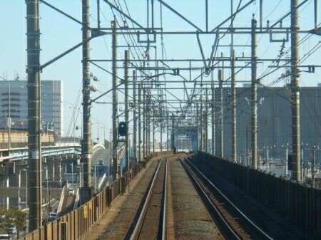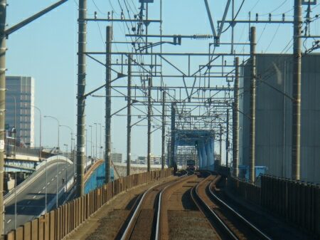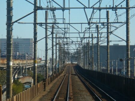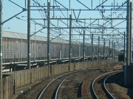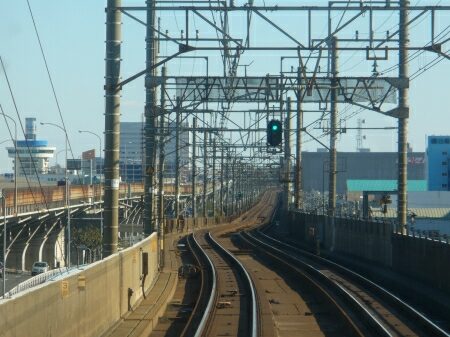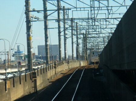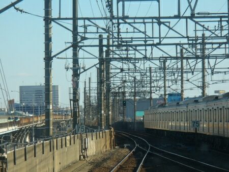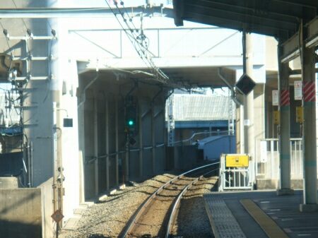 本線側はのぼり勾配になり、両線の高低差が縮まります。
