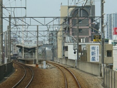 雑居ビル群の中を走ると武蔵新城駅です。