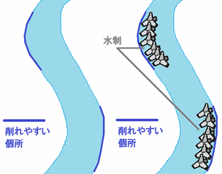 河川が蛇行していると、蛇行部分の円弧外側に水圧がかかってしまいます。