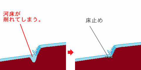 水叩きは落差による水圧で河床が削れてしまうのを防止する目的があります。