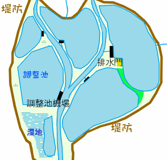 調整池は増水すると門を開いて調整池に水を引き込み、