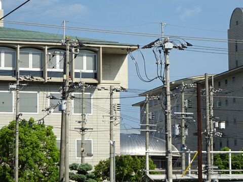5階建てのビルの前からいきなり始まる送電線です。