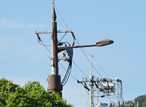 地中線引き上げの街路灯付き鉄製配電線柱もあります。