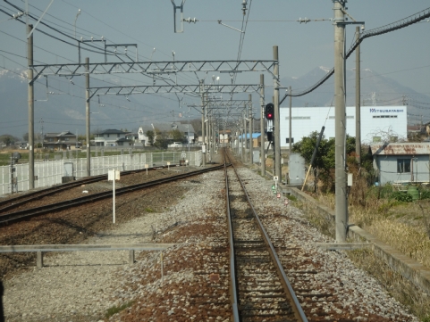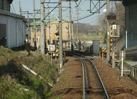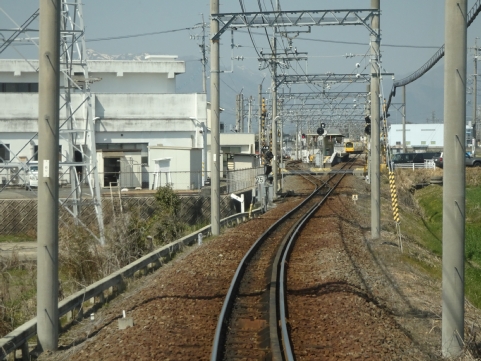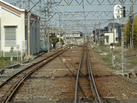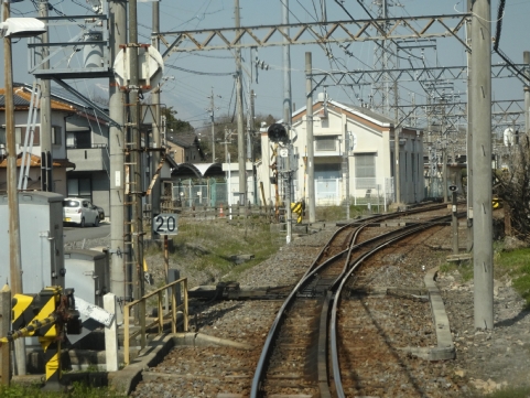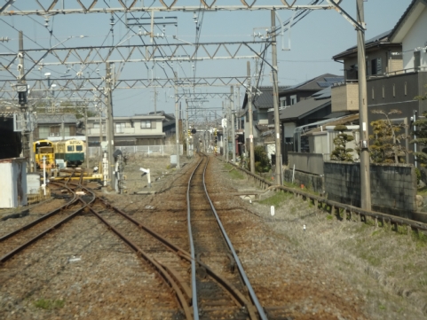 車庫への線路が分かれます。前方の建物は三岐鉄道の変電所です。
