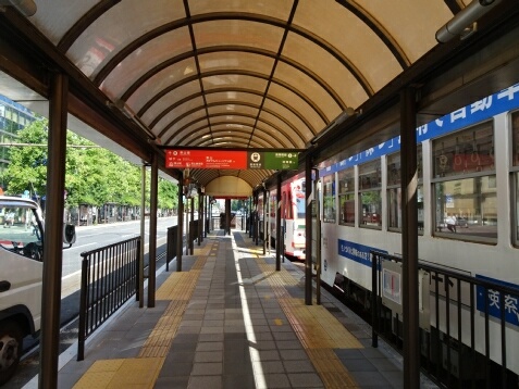 岡山駅前電停は駅前広場から市役所筋を渡った先にあり、