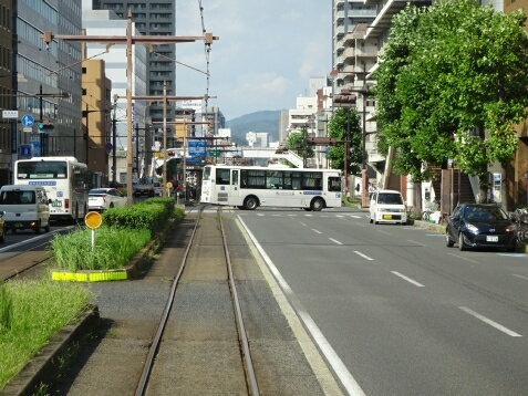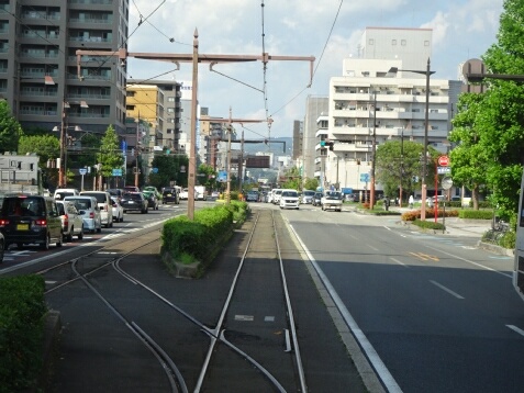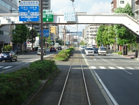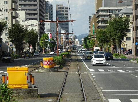 岡山駅前電停行きの線の柳川電停側へ渡り線が入ります。